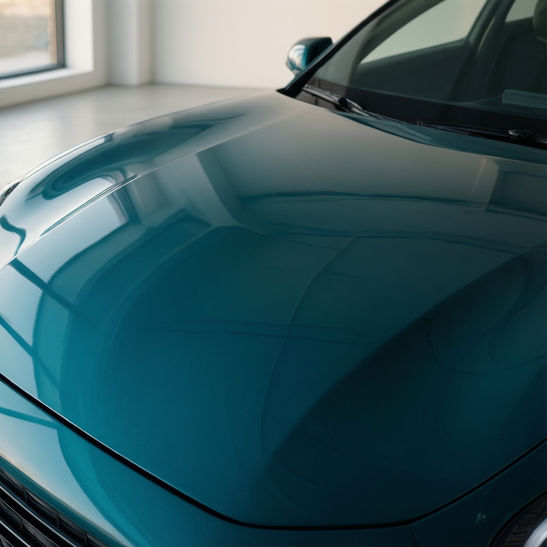 A close-up view of a ceramic coating application on a vehicle. The goal is to provide paint protection, enhance gloss and water beading effects, and show durability.